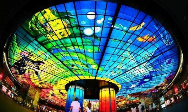 美麗島站 光之穹頂:高雄捷運紅線和橘線的交會車站,由義大利藝術家水仙大師打造的光之穹頂,運用玻璃馬賽克拼接技術,展現了宇宙誕生、人類發展等宏大場景,色彩絢麗。
